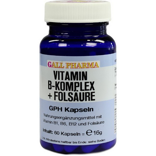 Die Vitamine sind in ihren Wirkungen sehr ähnlich. Die B-Vitamine werden vorwiegend in Pflanzen und von Mikroorganismen synthetisiert.Vitamin B-Komplex + Folsäure GPH Kapseln enthalten 0,46 mg Vitamin B1 (Thiaminhydrochlorid), 0,66 mg Vitamin B6 (Pyridoxinhydrochlorid), 1 µg Vitamin B12 (Cyancobalamin) und 100 µg Folsäure in einer Hartgelatinekapsel.