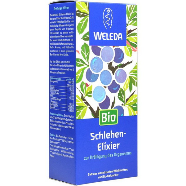 Das fruchtige Weleda Schlehen-Elixier spendet neue Lebenskräfte, belebt und kräftigt den Organismus. Das Getränk aus erntefrischen Wildfrüchten ist besonders zu empfehlen in der Erholungsphase nach erhöhten Belastungen, im Wachstum, bei besonderer Beanspruchung durch Schule, Ausbildung und Beruf, während der Schwangerschaft und Stillzeit und im Alter, wenn die körpereigenen Aufbaukräfte nachlassen. Für die Herstellung von Weleda Schlehen-Elixier werden vollreife Schlehenfrüchte aus ökologischer Wildsammlung schonend zu einem geschmackvollen Elixier verarbeitet.